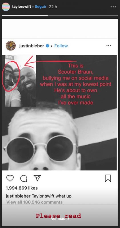 Pero esto no fue todo, Taylor aprovechó la situación para denunciar públicamente también a Justin Bieber, quien hace ya 3 años se burló de ella en redes sociales en lo que aparentaba ser un complot con Braun, el ex productor que la humillaba y que ahora, además de ser el manager de Bieber, también es dueño de las canciones que la artista produjo entre 2006 y 2017.