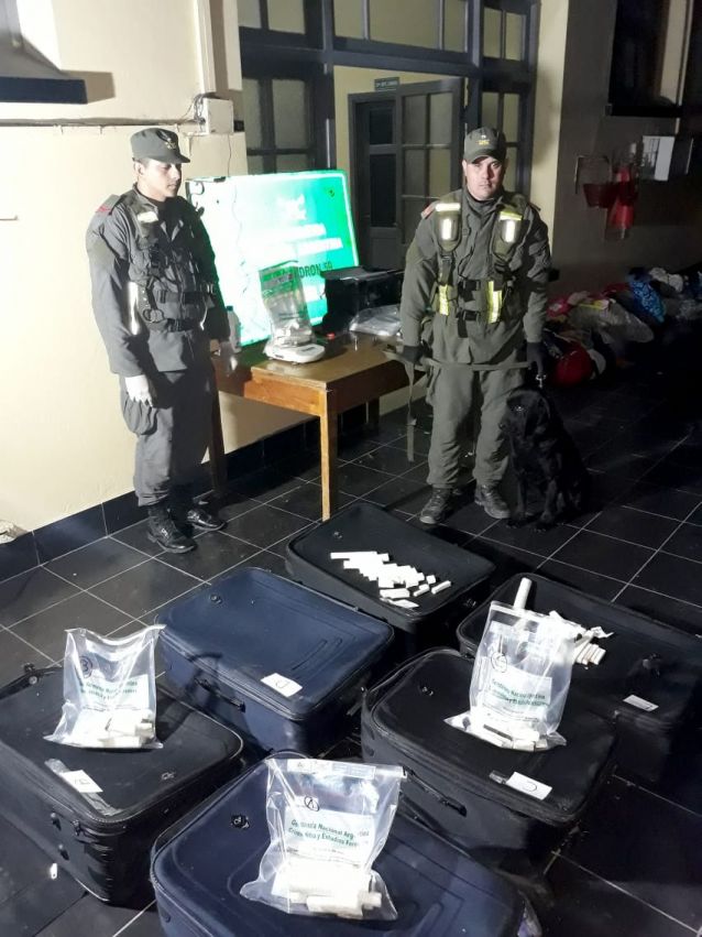 Al momento del control, con el apoyo de la perra antinarcóticos “Alfonsina” los gendarmes fueron alertados de la posible presencia de estupefacientes cuando el animal reaccionó al pasar frente a seis valijas.
