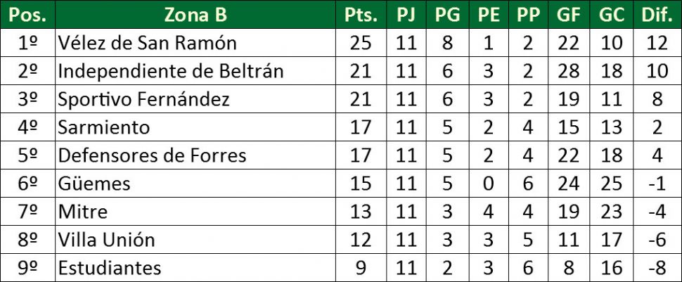 El desempate olímpico también le dio ese privilegio a Independiente de Beltrán que igualó en puntos en la segunda posición de la zona B con Sportivo Fernández. Se vio favorecido por el triunfo que logró por 2-0 ante el Albiceleste.