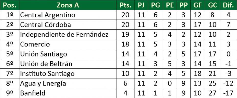 En la zona A hubo igualdad de puntos en la primera posición, sin embargo el conjunto bandeño se quedó con la ubicación, ya que en el cruce que tuvieron entre ambos se impuso por 1-0 sobre el Ferroviario.