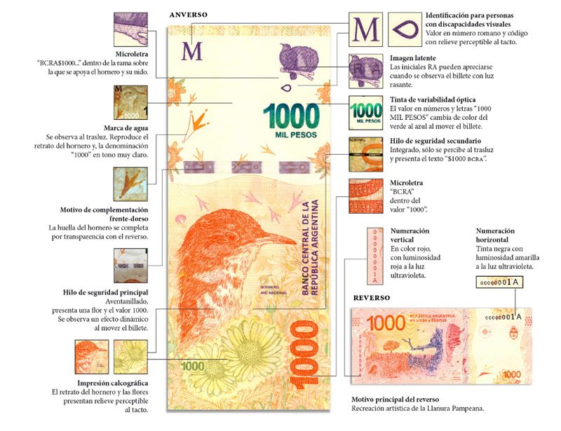 También el relieve al tacto y la marca de agua que revela el retrato del ave, en el caso de los mil pesos, y el monto.