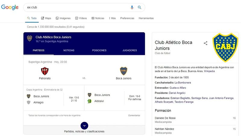 ¿Por qué? Porque algún hincha se avivó de que poniendo "ex club" en el buscador más importante del mundo devuelve como resultado los partidos de Boca, mostrando el de Patronato y el próximo con Almagro. Y esto, en cuanto al folclore, tiene una explicación como trasfondo: muchos hinchas de River cargan a Boca diciendo que es un ex club tras el 1-3 de Madrid.