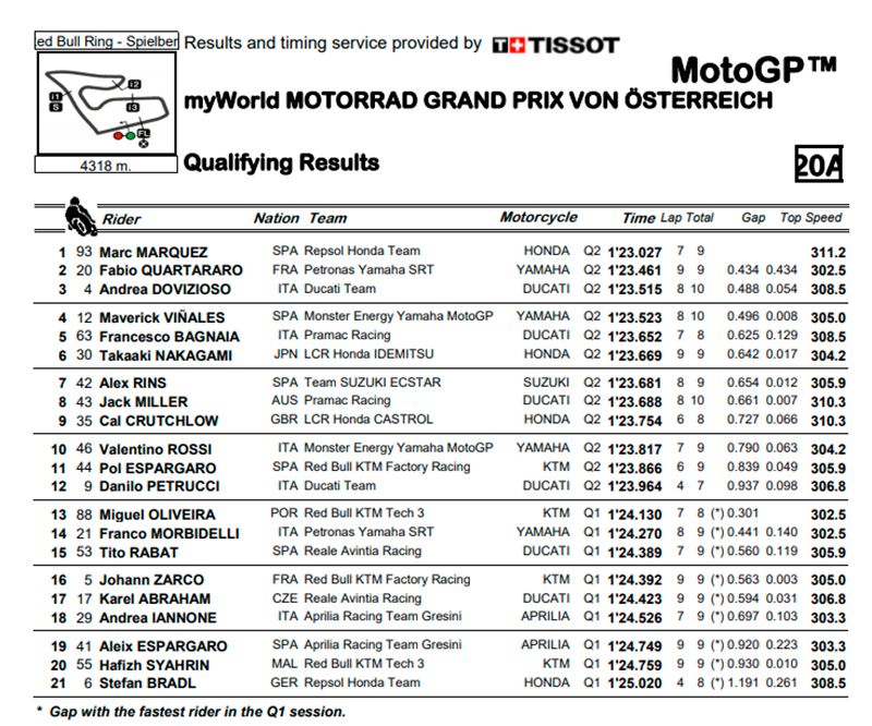 El español Marc Márquez (Honda), campeón vigente, consiguió hoy el mejor tiempo clasificatorio y largará mañana adelante en la clase Moto GP del Gran Premio de Austria del Mundial de Motociclismo, que cumple su undécima parada en el calendario anual de la categoría.