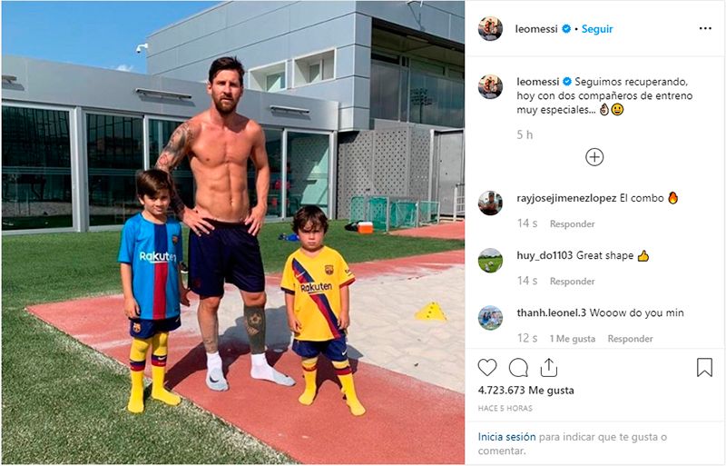 "Seguimos recuperando, hoy con dos compañeros de entreno muy especiales", fue el mensaje que publicó hoy el crack en su cuenta de Instagram con una foto acompañado de sus hijos Thiago y Mateo, ambos con vestimenta de Barcelona.
