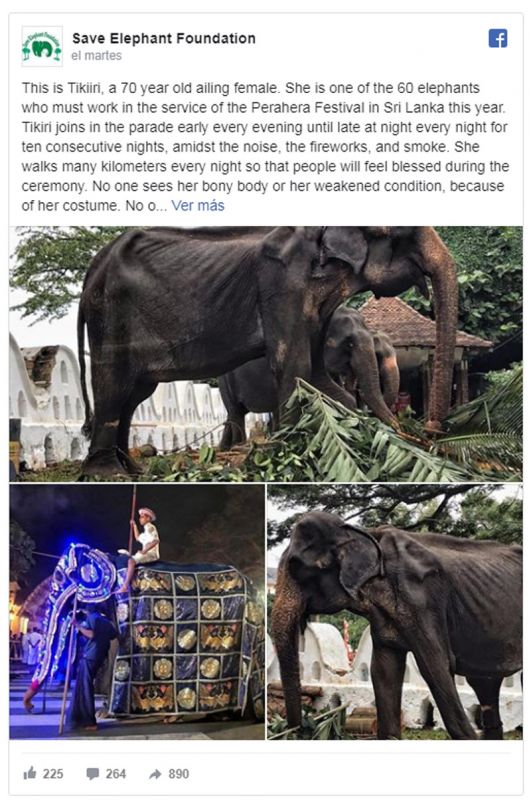 La Fundación Save Elephant publicó imágenes de una elefanta desnutrida a la que obligan a marchar por las calles de Kandy (Sri Lanka) durante el festival anual Esala Perahera, uno de los eventos budistas más antiguos que se celebra para rendir culto a la principal reliquia de la isla, el Diente de Buda.