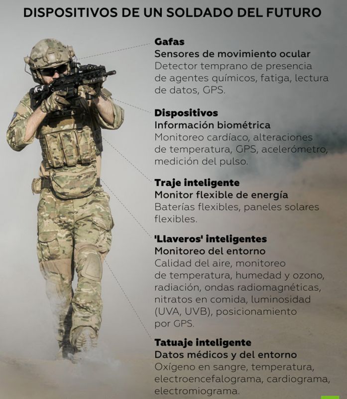 Asimismo, los sensores reforzarán la protección contra amenazas procedentes del agua y los alimentos,y brindarán una protección individual a cada efectivo. También gracias a estos dispositivos se hará un monitoreo de la salud de los soldados.