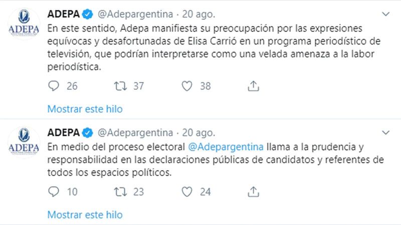 "Me extraña que Adepa y FOPEA no me pidieron una mínima explicación de mis dichos. Los dichos estaban dirigidos a funcionarios del Gobierno que daban información falsa a la prensa para desestabilizar al Gobierno de Macri. La condena iba a ser que yo notificaba quienes eran esos funcionarios", aclaró Carrió y se preguntó refiriéndose al mismo tema: "¿Se puede ser tan correcto hasta llegar a ser hipócrita o me condenan para quedar bien con Alberto Fernández?".