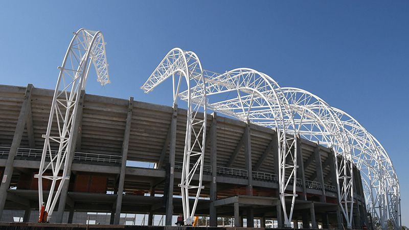 La construcción del estadio, que tendrá capacidad para 28.000 personas, avanza a pasos agigantados. Ya se cerró el anillo de las tribunas en cuanto a la estructura y se están colocando los soportes del techo, mientras arrancó la edificación de las locaciones dentro de las tribunas.