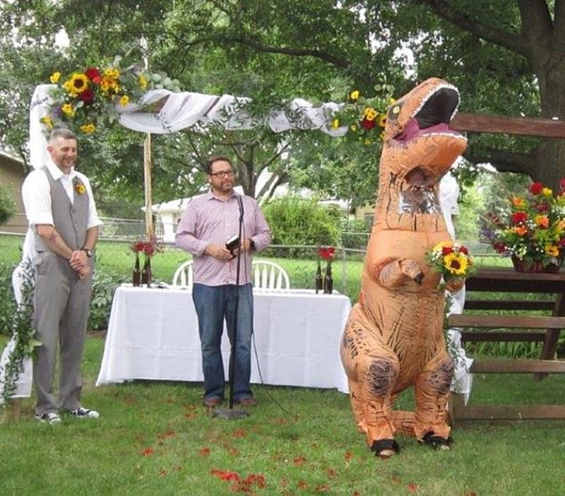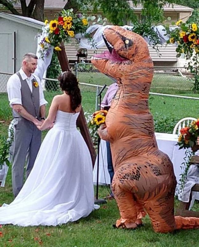 Enorme y poco serio, el disfraz fue el centro de atención, tanto en la ceremonia como en las fotografías, en las cuales Christina Meador, hermana de la novia, aparece también de dinosaurio.