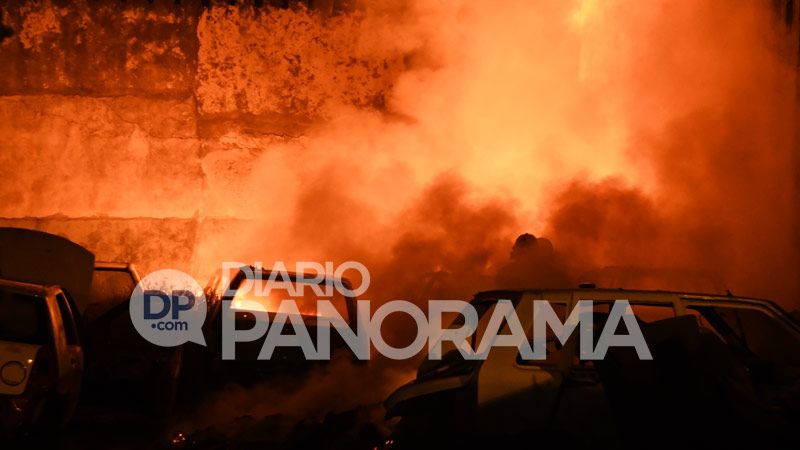 Al menos dos autos fueron consumidos por las llamas en el incendio de un depósito de remises, a metros de la estación de servicios de la costanera en el barrio Huaico Hondo.