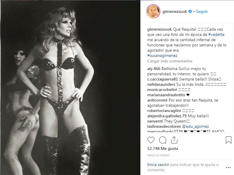 "¡Qué flaquita! Cada vez que veo una foto de mi época de vedette me acuerdo de la cantidad infernal de funciones que hacíamos por semana y de lo agotador que era", comentó Susana junto a la foto.