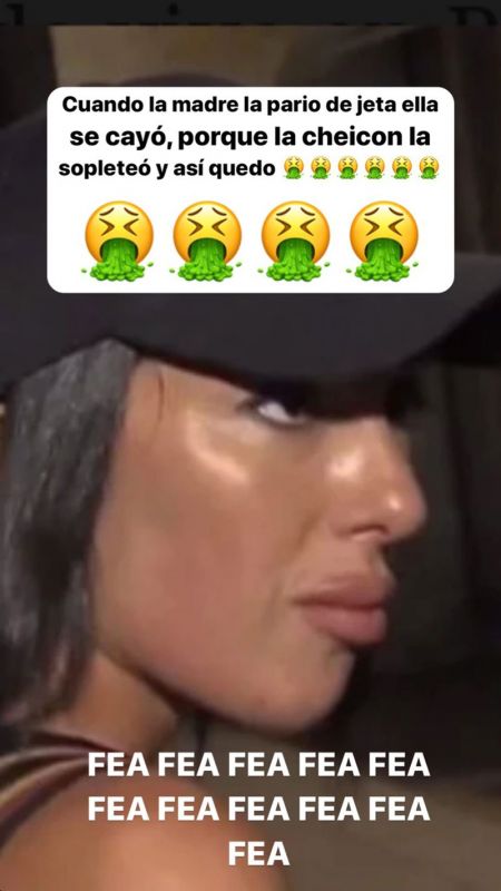 En otro repudiable posteo, aparece una foto de la actual novia del exfutbolista, con la palabra fea reptida varias veces: "Cuando la madre la parió de jeta, ella se cayó porque la ‘cheicon’ la sopleteó y así quedó”, agregó, con varios emojis de una carita vomitando.
