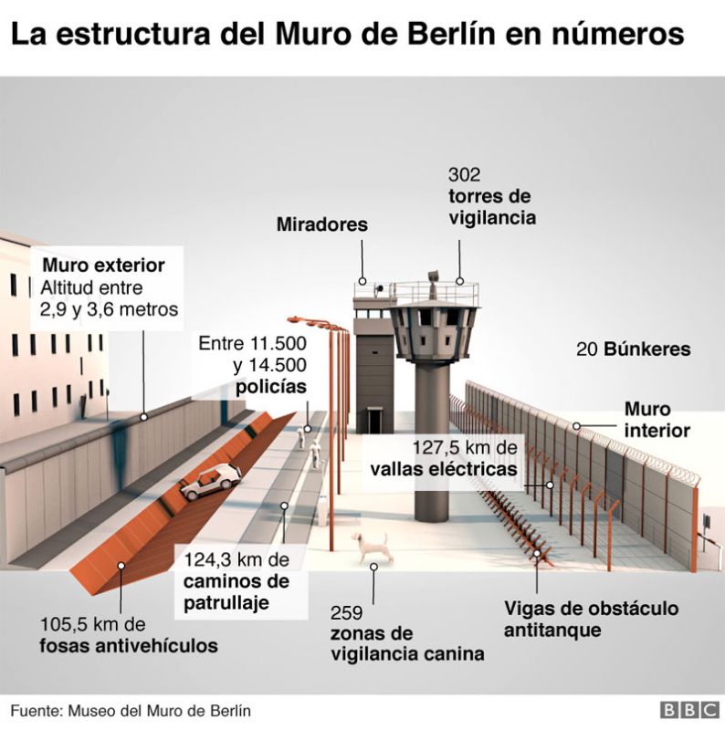 También se siguió perfeccionando el sistema de control fronterizo: había dos muros, uno interno y otro externo, vallas electrificadas, torres de vigilancia, perros guardianes, una zanja antivehículos y miles de policías y soldados que podían disparar a quién osase cruzar la fortificación.