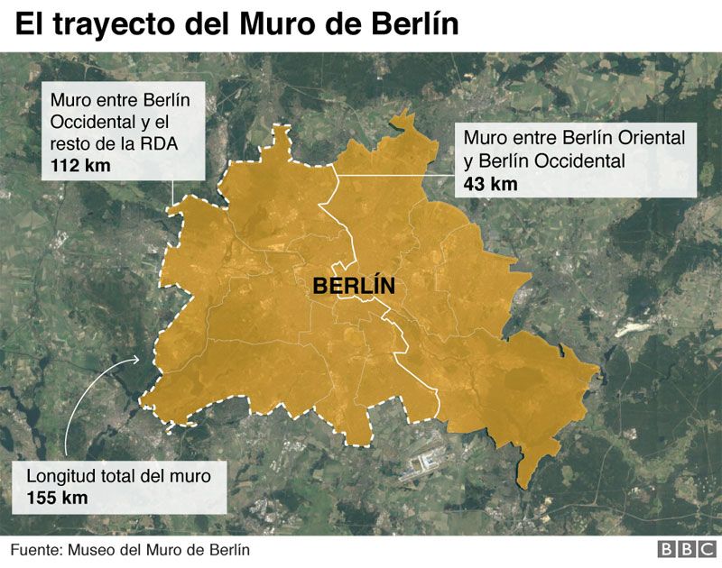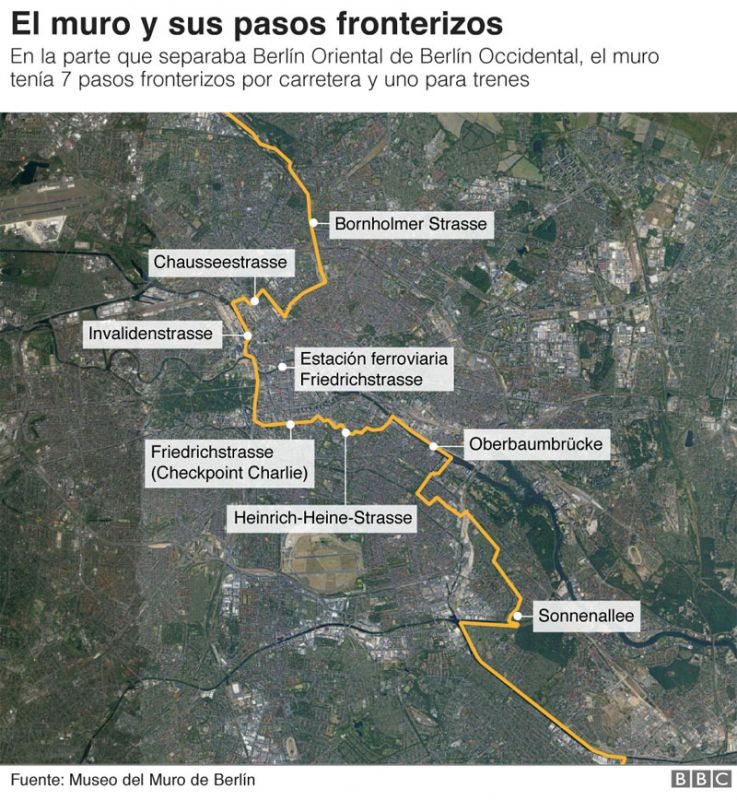 El muro que transcurría por el centro de la ciudad y que separaba Berlín Oriental de Berlín Occidental tenía una longitud de 43 kilómetros y 8 pasos fronterizos en total.