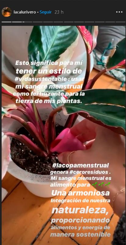“Esto significa para mi tener un estilo de vida sustentable: usar mi sangre menstrual como fertilizante para la tierra de mis plantas”, posteó en historias de Instagram.