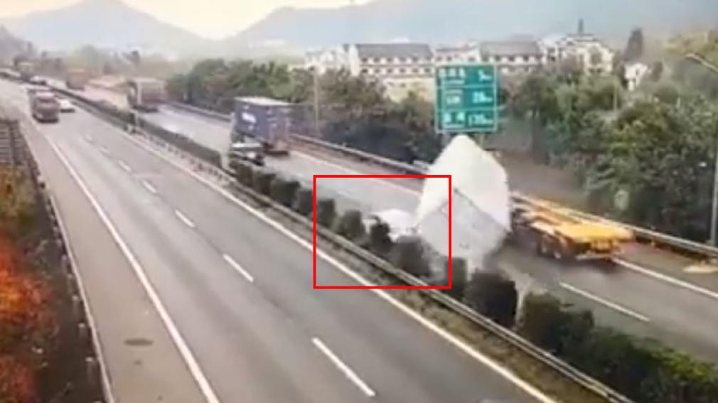 Una cámara de seguridad registró el pasado 29 de noviembre el momento en que un contenedor cayó de un camión que circulaba a gran velocidad por una autopista en las afueras de la ciudad china de Taizhou y por poco aplasta a un automóvil particular.