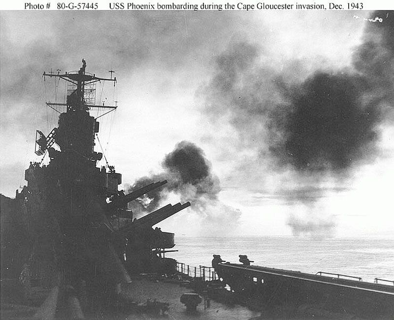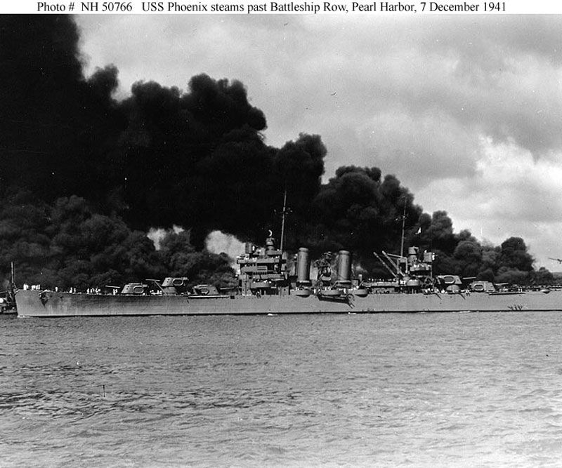 Mientras abría fuego sobre los aviones japoneses, uno de los barcos –amarrado a un boyón en el noreste de la isla de Ford- salió de la bahía entre barcos incendiados y semi hundidos y se incorporó a otras naves para buscar a los portaaviones japoneses. Era el acorazado Phoenix.