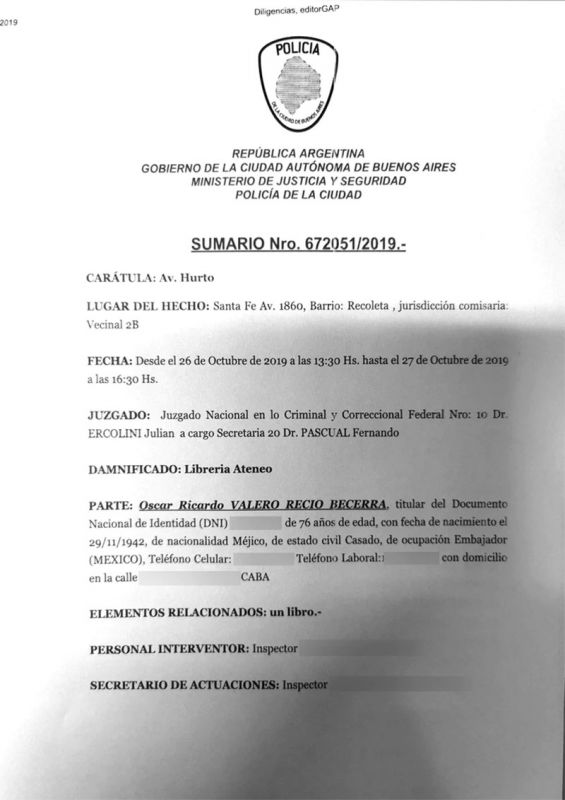 De inmediato, un inspector se dirigió a la librería, dialogó con el personal de seguridad y se encontró con el acusado, un hombre de 76 años. El acusado dio sus datos: Oscar Ricardo Valerio Recio Becerra, un domicilio en el barrio de Belgrano, un teléfono celular, su nacionalidad mexicana. Y después su ocupación: embajador de México en la Argentina, para estupor del inspector de turno.