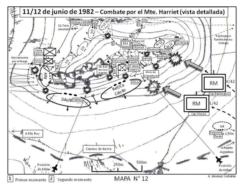 La noche del 11 de junio los ingleses iniciaron el ataque al Monte Harriet. Lo hicieron con el Comando 42 de los Royal Marines, con un batallón de la Guardia Galesa y con el apoyo de artillería del buque Yarmouth. Tenían planeado un ataque sorpresa, que se frustró cuando un británico -el marine Mark Curtis de solo 17 años- pisó una mina anti personal.
