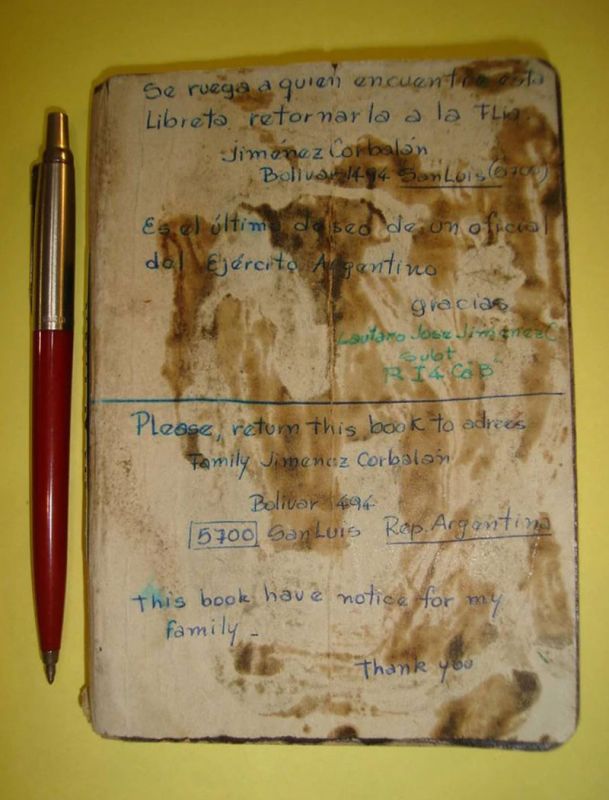 Cuando Jiménez Corbalán fue trasladado al Canberra, le quitaron cuatro rollos de fotografías que había tomado con su Kodak Instamatic. También quisieron quedarse con una libreta en la que, día a día, iba anotando sus impresiones. En la tapa había escrito en español y en inglés “favor de entregar esta libreta a la familia Jiménez Corbalán…”