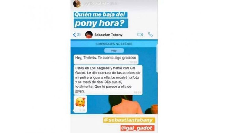 La artista argentina de 27 años, que se encuentra actualmente en Mar del Plata realizando la obra “Fuera de Línea”, difundió una captura de pantalla de WhatsApp con Tabany donde en principio se puede leer: "Hola, Thelmis. Te cuento algo gracioso. Estoy en Los Ángeles y hablé con Gal Gadot".