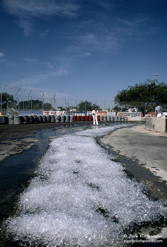 A todo esto los tres proveedores de neumáticos, Michelin, Goodyear y Pirelli no entendían el asfalto, que se seguía rompiendo. Decidieron ahorrarse el uso de las gomas de clasificación. Sus blandos compuestos no duraban ni media vuelta. “Había sitios donde se podía levantar el asfalto con las manos”, era el hit que sonaba en los boxes, donde las bolsas de hielo fueron elementos preciados para enfriar los motores.