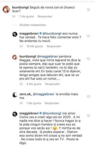 Pero eso no quedó ahí, esta usuaria @lourdsongt continuó con su intencionalidad picante y retrucó: “Perdona Maggie, viste que Mirtha te dice siempre la posta, dijo que Suar te pidió que te operes la nariz también. No lo dije yo. En todo Canal 13 lo dijeron, tengo amigas que laburan ahí, que se yo por ahí fue solo un rumor…”.