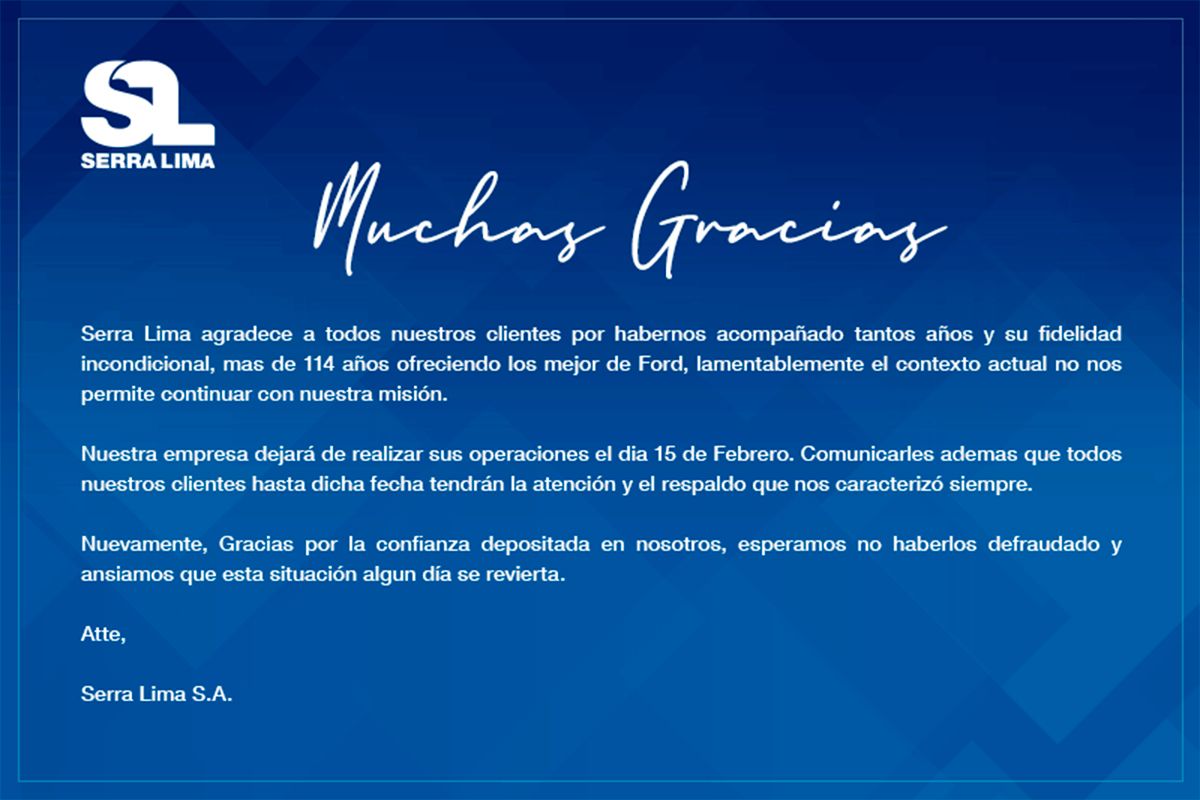 El concesionario de Ford, Serra Lima anunció este lunes que cerrará definitivamente sus puertas tras 114 años vendiendo vehículos Ford. Sus operaciones habían comenzado en 1908 ofreciendo el Ford T.