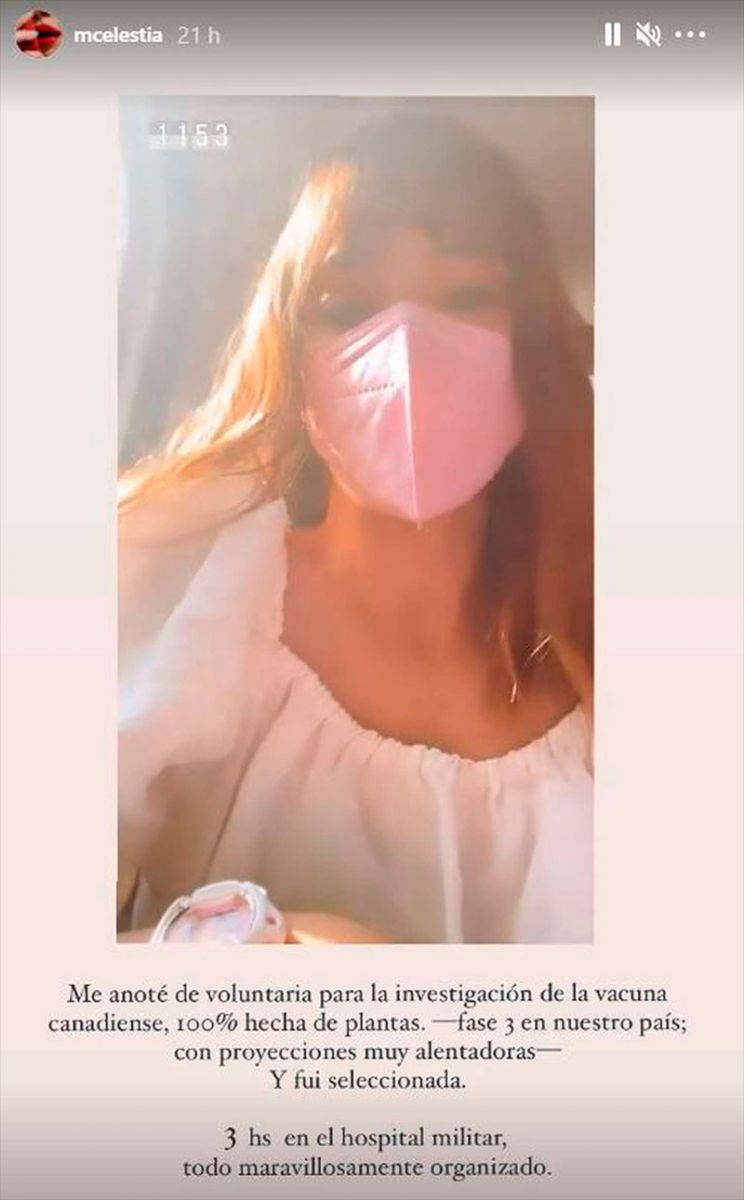“100% hecha de plantas. En nuestro país se encuentra en Fase 3, con proyecciones muy alentadoras. Fui seleccionada y pasé tres horas en el Hospital Militar. Todo maravillosamente organizado. No dejemos de cuidarnos entre todos. Que esto pase pronto”, comentó en Instagram sobre su experiencia con la fórmula del laboratorio Medicago.