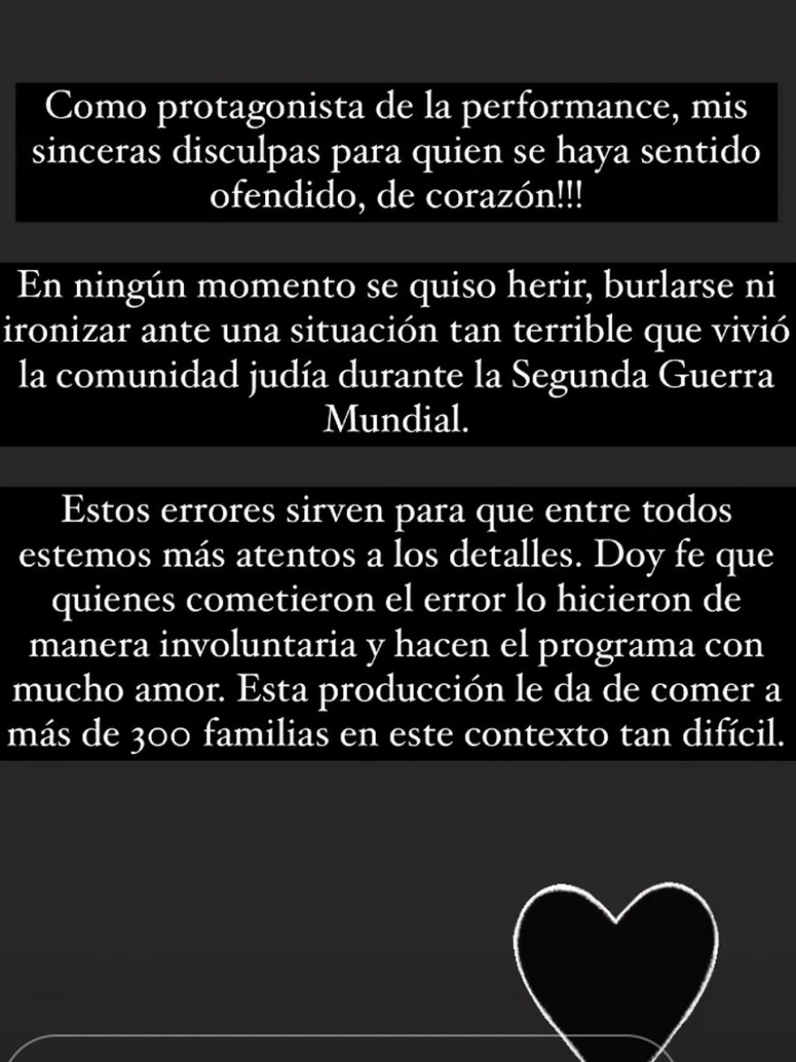 “Como protagonista de la performance, mis sinceras disculpas para quien se haya sentido ofendido, ¡de corazón!”, escribió al inicio de una de sus historias de la red social. “En ningún momento se quiso herir, burlarse ni ironizar ante una situación tan terrible que vivió la comunidad judía durante la Segunda Guerra Mundial”, añadió. “Estos errores sirven para que entre todos estemos más atentos a los detalles”.