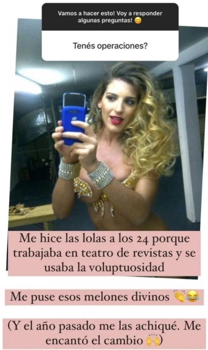 Uno de sus followers le consultó si tiene operaciones estéticas y contó algo de lo que ya había hablado hace un tiempo. “Me hice las lolas a los 24 porque trabajaba en teatro de revista y se usaba la voluptuosidad”, expresó como respuesta.