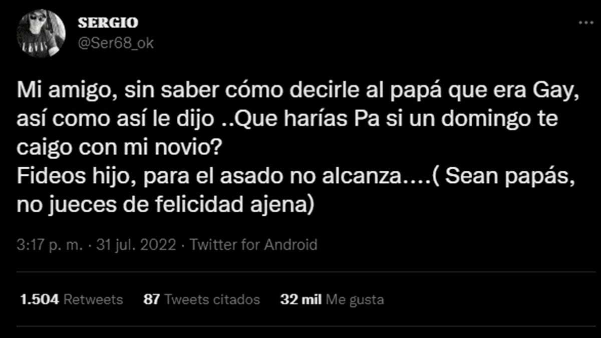 “Mi amigo, sin saber cómo decirle al papá que era gay, así como así le dijo… Qué harías pa si un domingo te caigo con mi novio? ‘Fideos hijo, para el asado no alcanza’”, compartió Sergio, en su cuenta personal, y agregó: “Sean papás, no jueces de felicidad”.