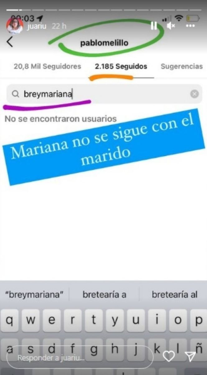 Finalmente, Juariu descubrió que Brey había dejado de seguir en Instagram a Melillo y que él tampoco mantenía el contacto virtual con ella.