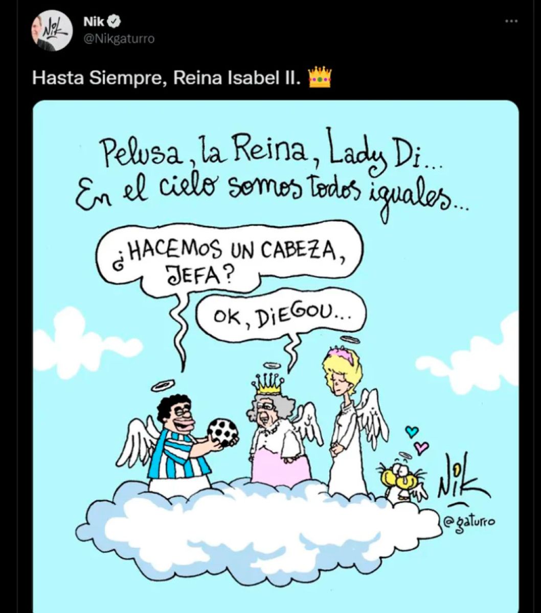 Nik, el historietista argentino, difundió un posteo con una imagen tras la muerte de la reina Isabel II. El creador de Gaturro realizó en Twitter una ilustración simbólica en el que aparece Diego Maradona, la monarca británica y Lady Di en el cielo.