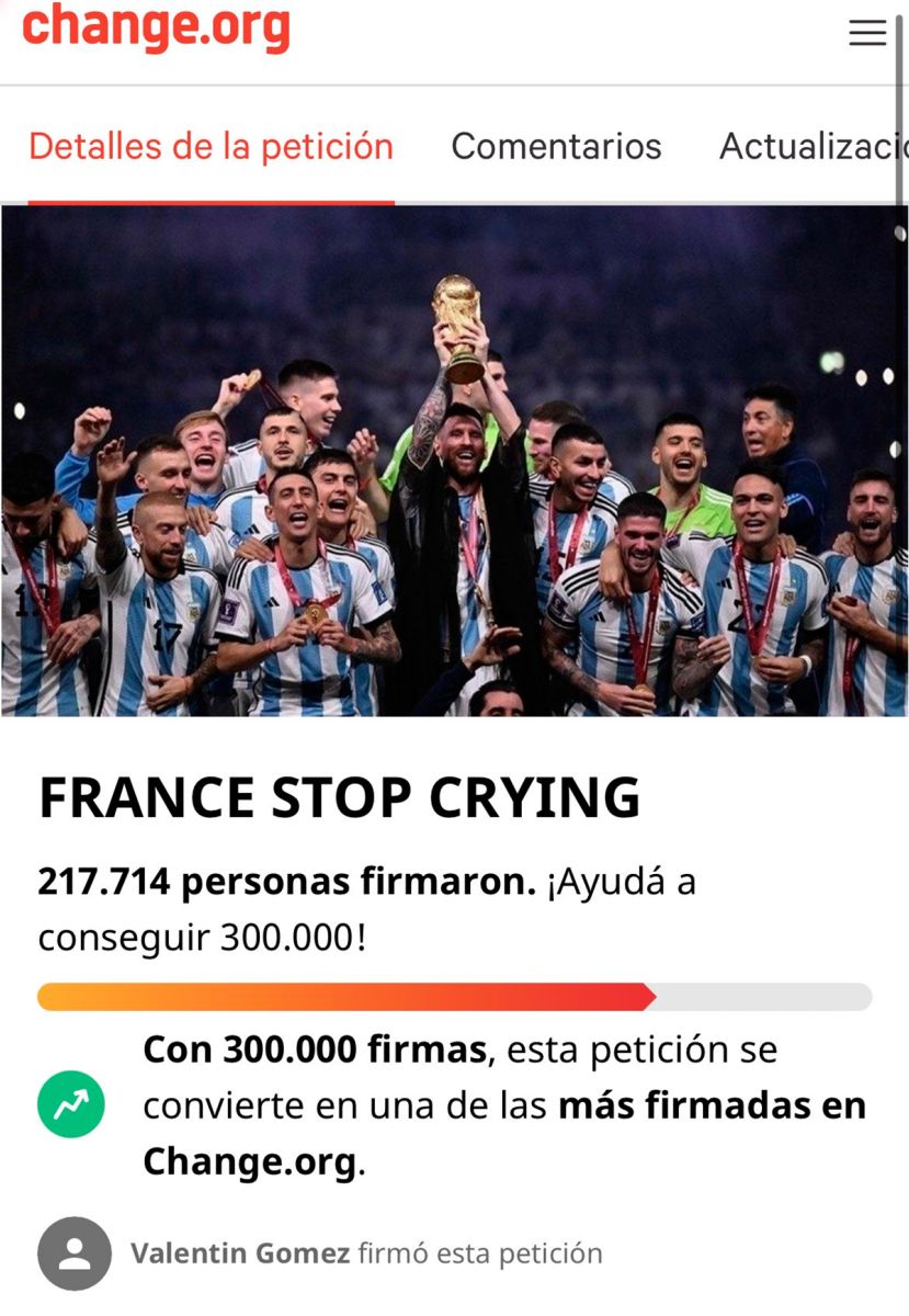 El pedido, formulado a través de la plataforma de Change.org, reclama que los franceses acepten que Argentina es el campeón del mundo y que "dejen de llorar".