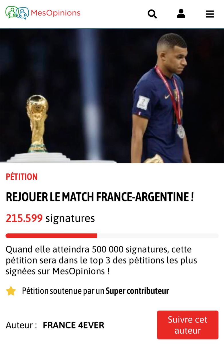 La respuesta desde la Argentina no tardó en llegar: "Desde que les ganamos la final del mundial de fútbol, los franceses no paran de llorar, quejarse y no aceptan que Argentina es el campeón del mundo. Esta petición es para que los franceses dejen de llorar y acepten que (Lionel) Messi es el mejor de la historia del fútbol y tiene de hijo a (Kylian) Mbappé", plantea Valentín Gómez, impulsor de la campaña de recolección de firmas.