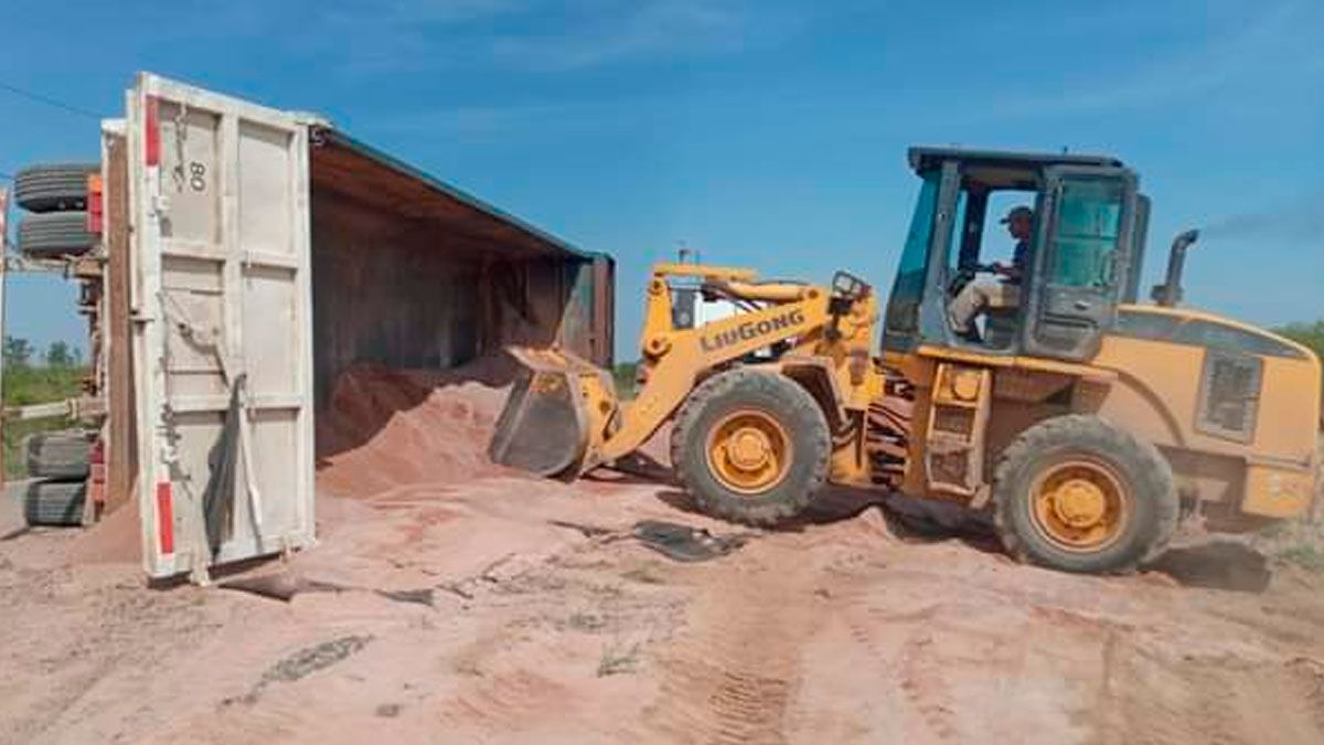 Como consecuencia la batea terminó volcada sobre la ruta y la carga de ripio esparcida hacia un lateral de la banquina.