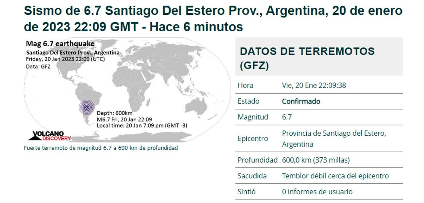 Según organismos como el Inpres, el movimiento se reportó a las 19.09 del 20 de enero; a 593 kilómetros de profundidas y tuvo su epicentro a 42 kilómetros al sudoeste de Campo Gallo.