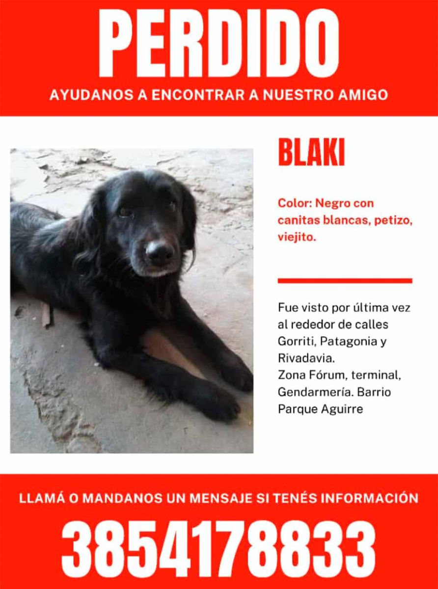 Blaki es un perrito de color negro, con canas blancas, petizo., y es viejito. Su familia asegura que se fue siguiendo a alguien alrrededor de las calles: Gorriti, Patagonia, Rivadavia.