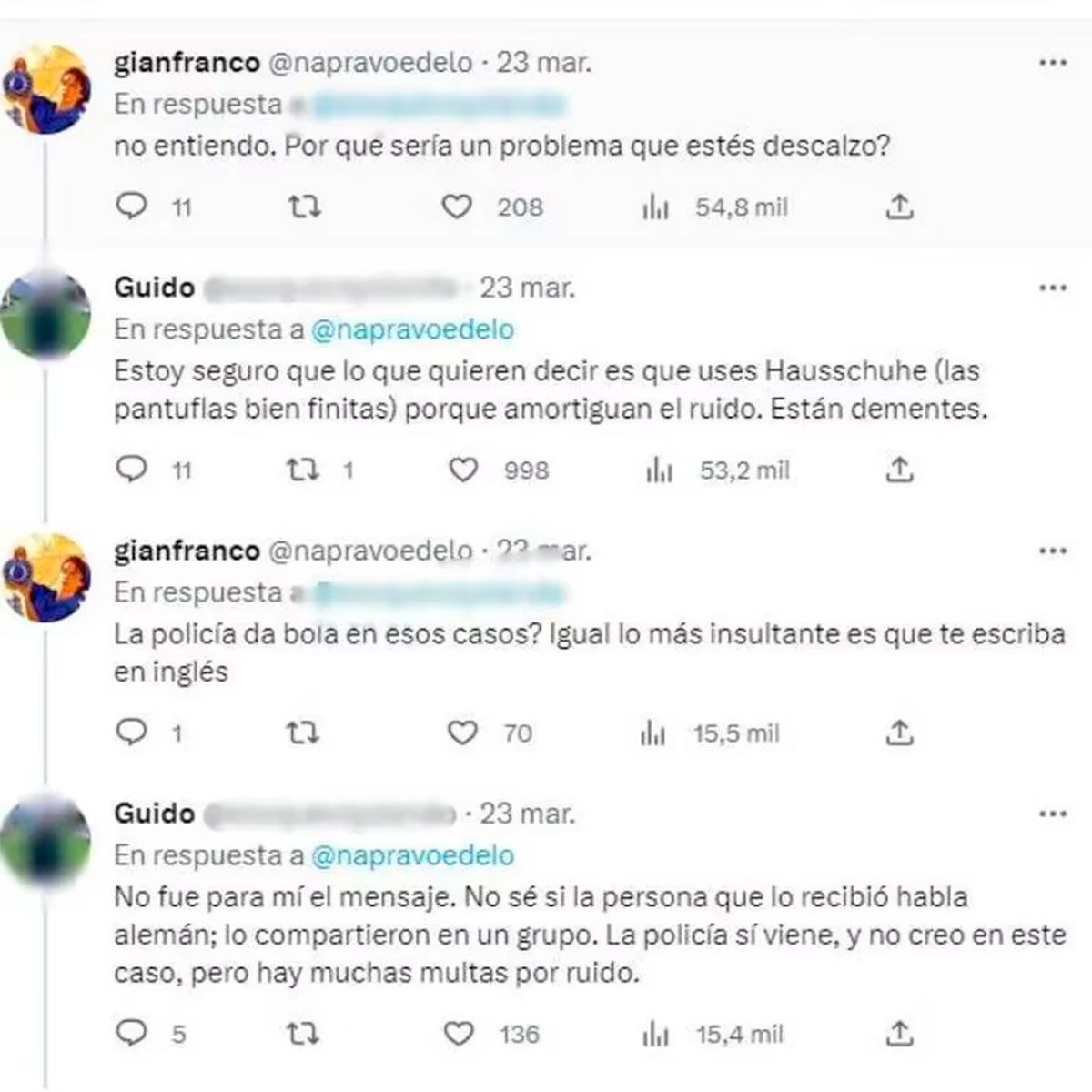 “No entiendo. ¿Por qué sería un problema que andes descalzo?”, quiso saber un seguidor de Guido, que pronto respondió: “Estoy seguro que lo que quieren decir es que uses hausschuhe (las pantuflas bien finitas) porque amortiguan el ruido. Están dementes”.