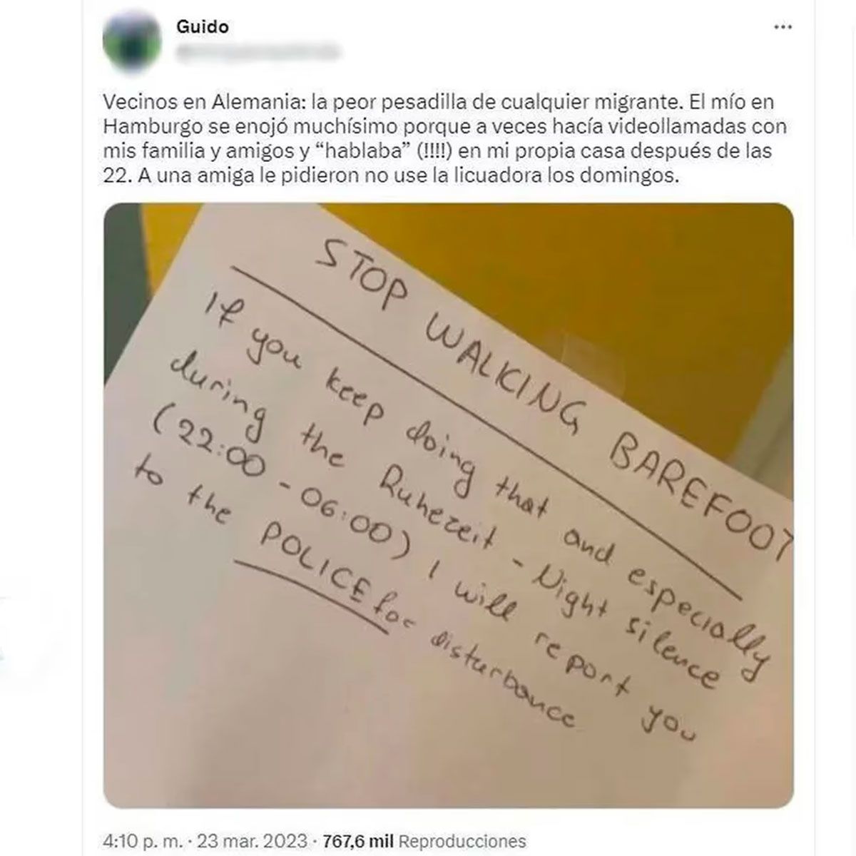 La extraña exigencia, que obliga al habitante de su propia casa a no caminar descalzo, que subió Guido a Twitter -y más tarde borró- fue acompañada por un mensaje en el que el tuitero contó su propia experiencia con sus vecinos teutones. “Vecinos en Alemania: la peor pesadilla de cualquier migrante. El mío en Hamburgo se enojó muchísimo porque a veces hacía videollamadas con mis familia y amigos y ‘hablaba’, en mi propia casa después de las 22″, escribió, y añadió otra anécdota cercana: “A una amiga le pidieron no use la licuadora los domingos”.