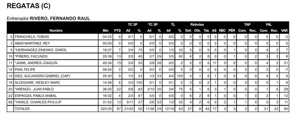 Fabián Ramirez Barrios sumó 20 puntos, 5 rebotes y 4 asistentes, mientras que Eric Anderson aportó 17 tantos y 9 tableros. En Regatas 22 puntos para Arengo.