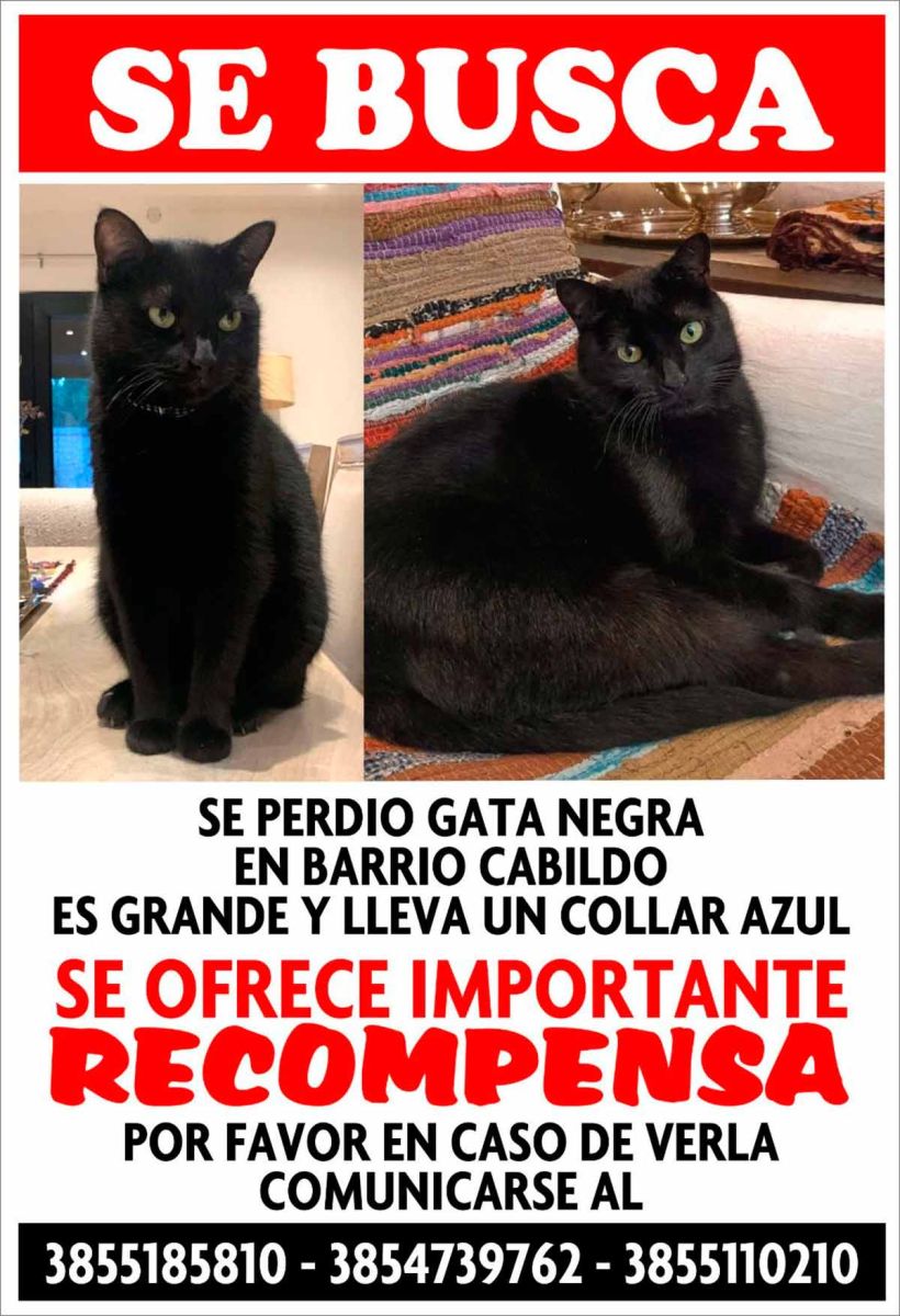 Sundry es una hermosa gata negra de 7 años que se perdió en el barrio Cabildo. La mascota se extravió el 28 de marzo de 2023 y su familia no deja de buscarla.