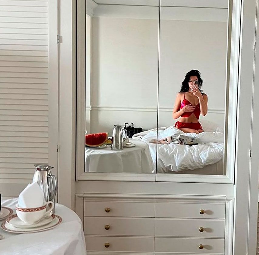 La artista británica, que mantiene a sus fanáticos al tanto de su día con carruseles de imágenes en las redes, mostró una mirror selfie desde la cama de un hotel en Francia. ¿El look de recién levantada? Eligió un conjunto de vinilo rojo formado por un corpiño estilo top con breteles finos y una minifalda tipo pareo que se anuda en un lateral.
