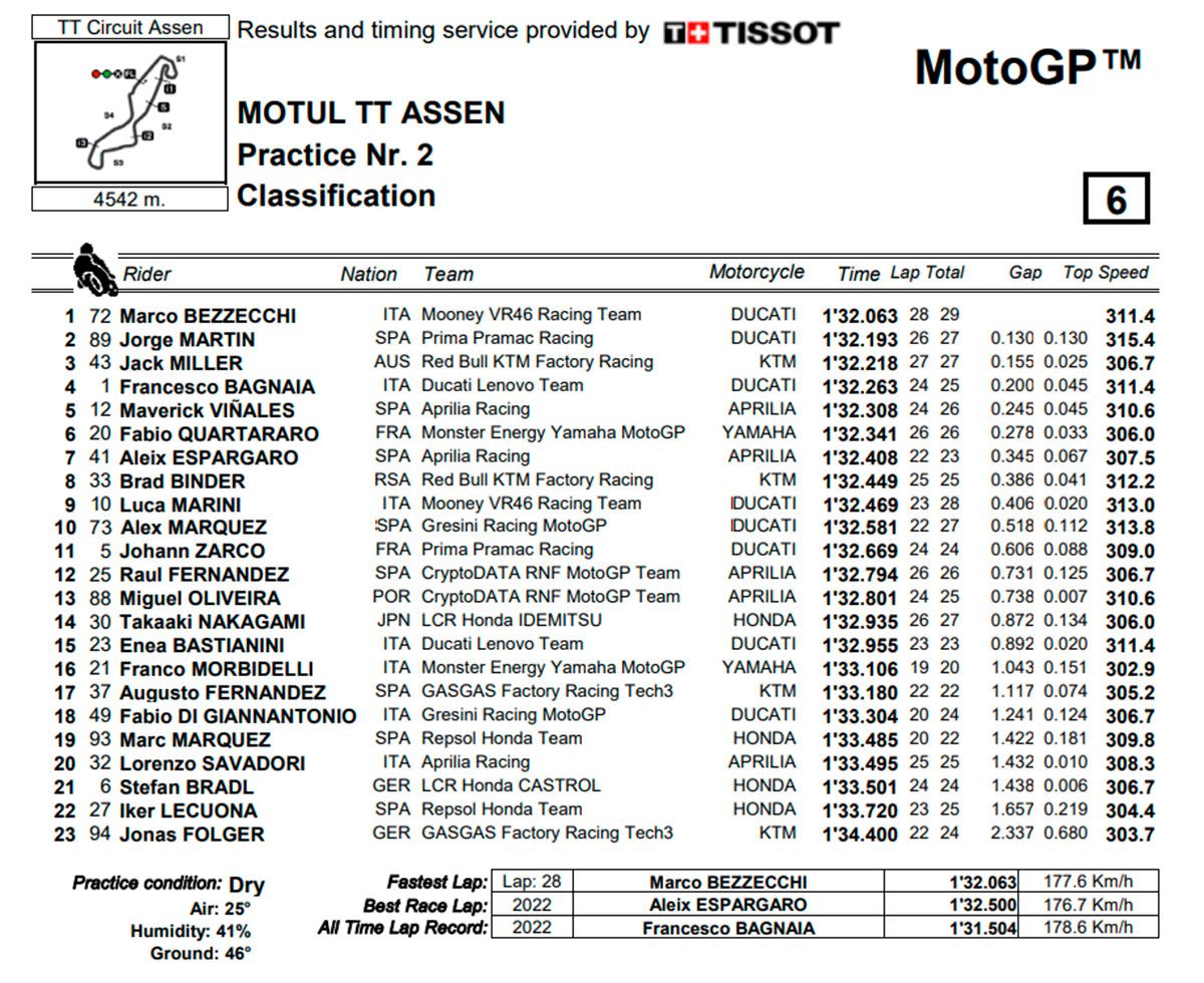 Marco Bezzecchi, con Ducati, resultó el más veloz en la segunda sesión de entrenamientos del MotoGP, que durante este fin de semana tendrá el desarrollo de la octava fecha del Mundial de la categoría en el autódromo de Assen, en los Países Bajos.