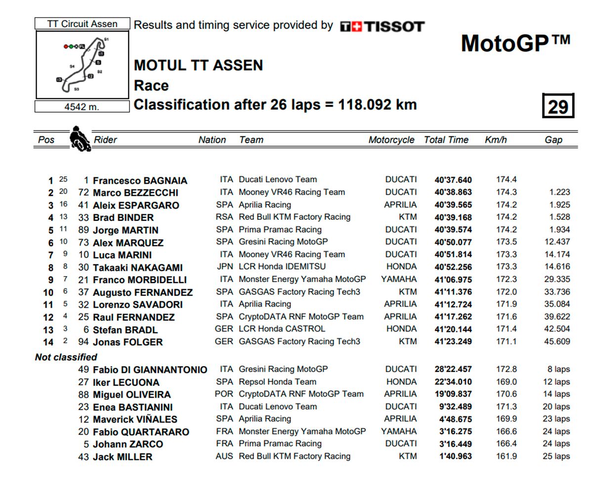 Con la penalización, Binder se quedó con el cuarto puesto; el español Jorge Martín (Ducati) arribó quinto, a 1s. 934/1000, mientras que Alex Márquez (Ducati) finalizó sexto, a 12s. 437/1000.