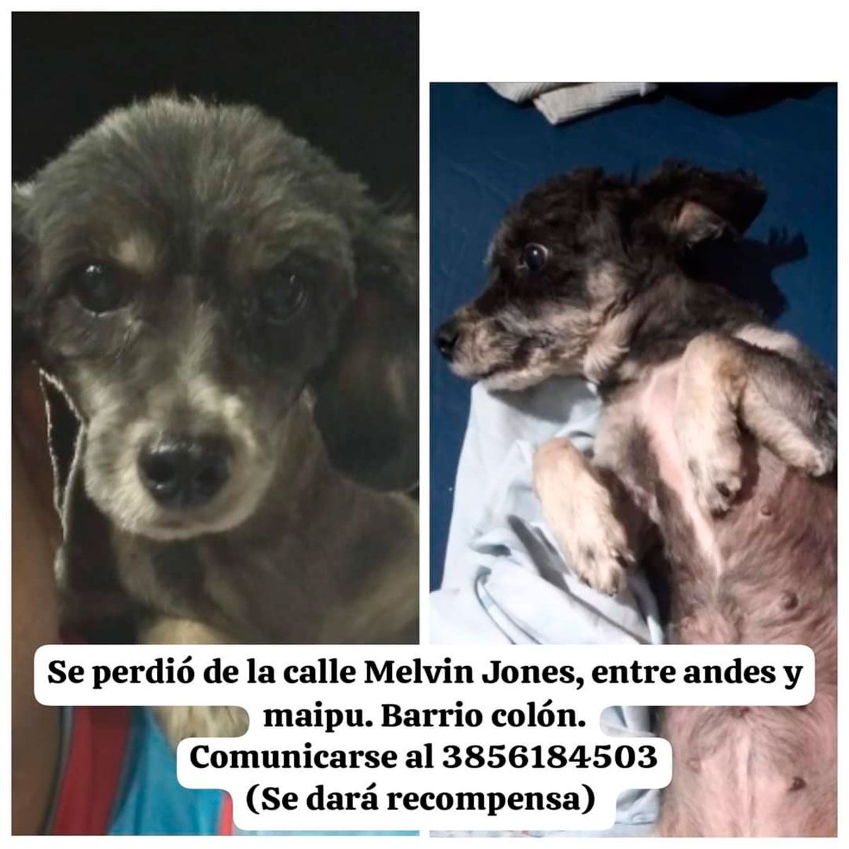 Se trata de una caniche viejita de color negro con blanco, estatura media y pelo corto. Fue vista por última vez en calle Melvin Jones, entre Andes y Maipú.