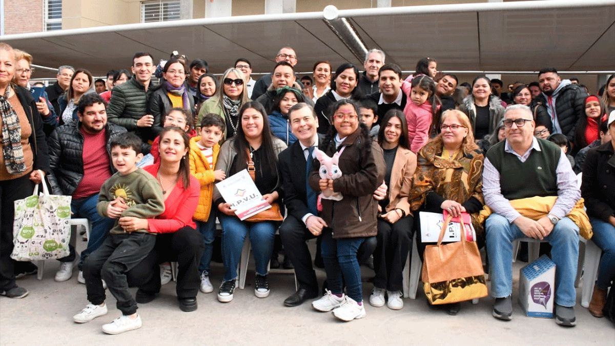 El gobernador realizó el corte de cintas y luego acompañó a los adjudicatarios Romeo Chiaraviglio y Melina Ceratto a su nuevo hogar, a quienes entregó las llaves y documentación.