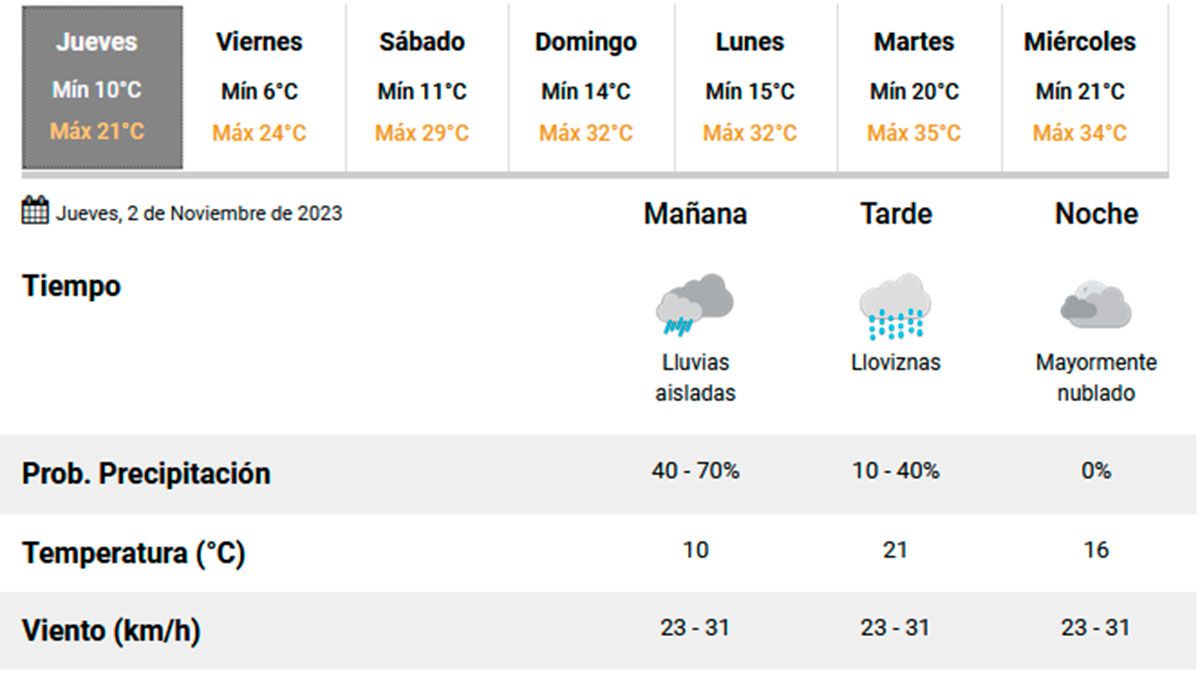 Para el fin de semana, momento esperado para descansar de la rutina, se esperan agradables condiciones climáticas, con máximas que podrían llegar a los 29 grados, el sábado, y 32, el domingo.