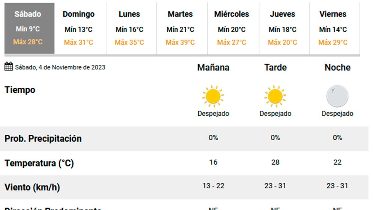 De acuerdo a lo informado por el Servicio Meteorológico Nacional en su página web, la máxima de la jornada trepará hasta los 28 grados y el cielo permanecerá despejado durante todo el día. Además, precisa el organismo, los vientos serán moderados, principalmente del sector noreste, a una velocidad que oscilará entre los 13 y 31 kilómetros por hora.